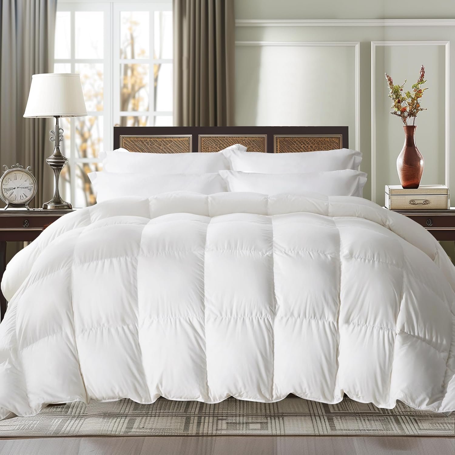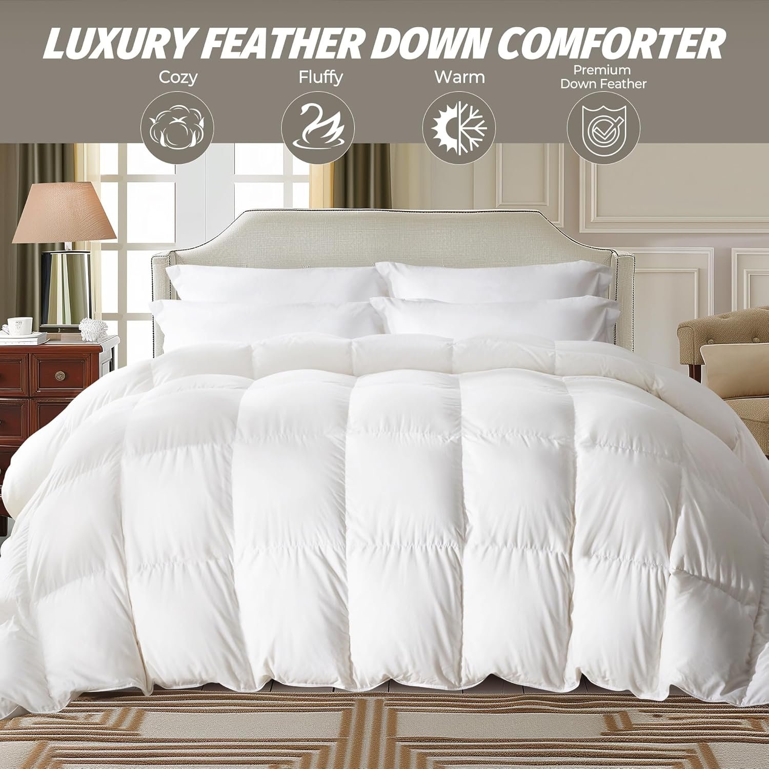 - 【Unique Design】- Our feather comforter full/queen size (90*90”) features double-needle stitching and piping to enhance its durability. This keeps the top and bottom shells together better and prevents the seams from opening up and the filling leaking out.